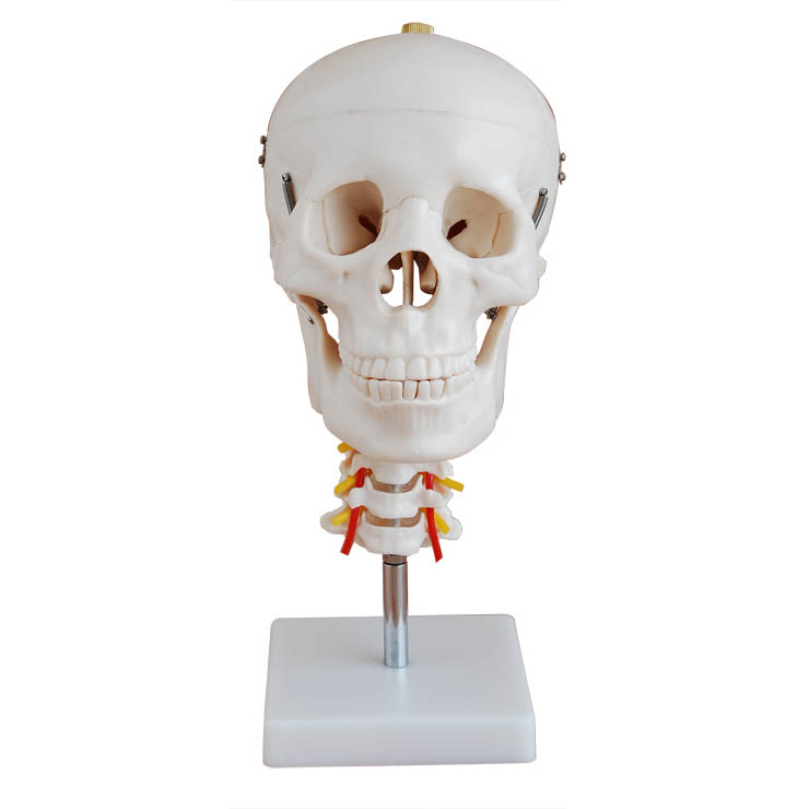 該頭顱骨帶頸椎模型由頭骨和7節(jié)頸椎組成,帶頸椎動脈,有底座。