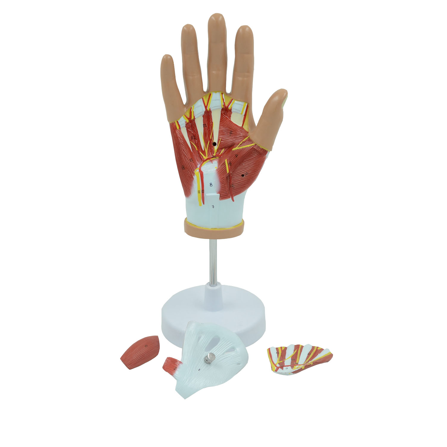 此款模型共4部件,掌腱膜和掌短肌可以拆下來,以觀察更深層次的肌肉,肌腱,血管和神經(jīng)網(wǎng)絡。深層的掌部斷面出示了長健,腕部韌帶和正中神經(jīng)。手掌機部分拆下后,可以看到手掌弓及其分支和神經(jīng)分布。1比1大小,方便教學使用。