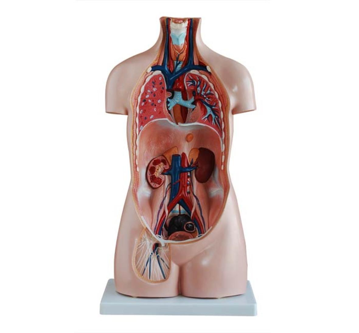 這個(gè)無性模型包括 20 個(gè)可解剖的部分:軀干、頭部、眼睛、大腦、帶有胸骨和肋骨附件的肺(2 部分)、心臟(2 部分)、胃(2 部分)、肝臟、脾臟、腎臟、 腸道(4 部分)、膀胱和椎骨脊神經(jīng)(2 部分)。露背。安裝在塑料底座上。