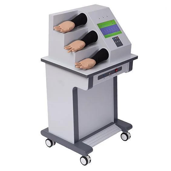 采用三只手組合模式,區(qū)別于一只手形式對(duì)浮中沉、血管粗細(xì)、血液粘度無(wú)法明確區(qū)別的嚴(yán)重缺陷。配備10.5寸液晶顯示多媒體操作界面,顯示內(nèi)容包括:聯(lián)機(jī)模塊,練習(xí)模塊選擇。聯(lián)機(jī)模式下學(xué)生機(jī)可受到教師機(jī)端控制,控制有效距離為200米,方便大范圍下教學(xué)使用。1號(hào)手以血管粗大、脈搏洪大、脈位偏浮為主;2號(hào)手以脈道粗細(xì)適中、脈位中等類脈象為主;3號(hào)手以血管纖細(xì)、脈位較沉類脈象為主。