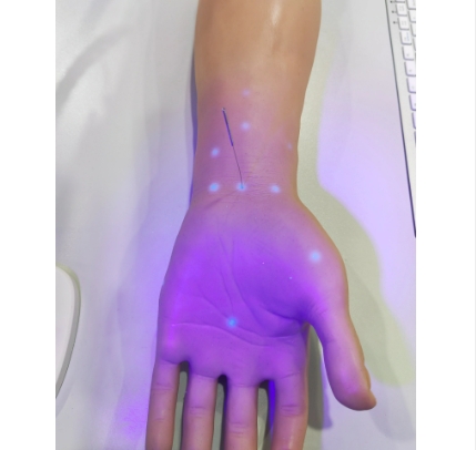 模型仿照正常手部比例大小,表皮采用特殊硨膠材質(zhì),內(nèi)置真實(shí)骨骼肌肉,可彎曲,體表特征明顯,模型上有大于50個(gè)穴位可以和系統(tǒng)進(jìn)行交寫操作。