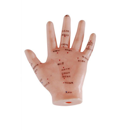 用軟而光亮的PVC制成的大規(guī)格的人手模型,顯示手背上的20個(gè)穴位和手心上13個(gè)穴位,穴位用漢字或數(shù)字標(biāo)注。附中英文使用手冊(cè)。