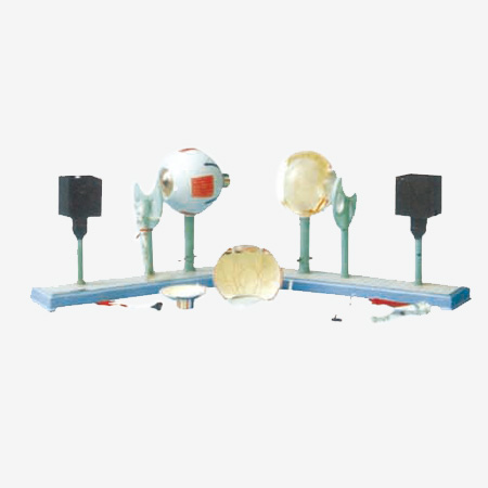由成人眼球、光源、校正鏡片、活動(dòng)成像顯示屏及底座組成。通過(guò)眼球前后極在正中與水平成75度切面,示眼球壁三層被膜,眼球內(nèi)晶狀體(可改變曲率),玻璃體和虹膜。由外向內(nèi)三層被膜做成梯形切面,并示其各部結(jié)構(gòu)。