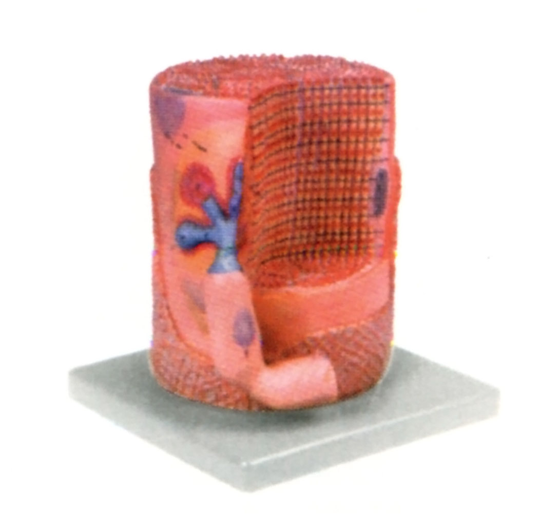 博友BM2013骨骼肌纖維與運動終板放大模型顯示骨骼肌纖維部分剖面和運動終板在電子顯微鏡下的放大結(jié)構(gòu),可觀察骨骼肌纖維肌內(nèi)膜、成纖維細胞核、肌細胞核、肌絲、肌原纖維、神經(jīng)元軸突、軸突失去髓鞘、運動終板突觸剖面、突觸前膜、突觸后膜、線粒體等結(jié)構(gòu)。