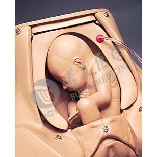 Full-term fetal baby with palpable fontanels, spine, shoulders, elbows, and knees. This fetal baby may be placed in normal, breech, or transverse positions. It is cradled between two “cushions” which may be inflated independently of each other - inflation of the lower cushion raises the fetus to the desired position; inflation of the upper cushion creates a firm abdomen as in the ninth month of pregnancy. This module will fit any Gaumard Advanced Childbirth Simulator purchased since 1989.
