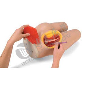 A simulated bony structure is embedded in the torso and represents the superior end of the femur, or greater trochanter, the posterior superior and anterior superior iliac spines, and the sacrum. The bony structure provides palpable anatomical landmarks so students can identify proper injection sites.